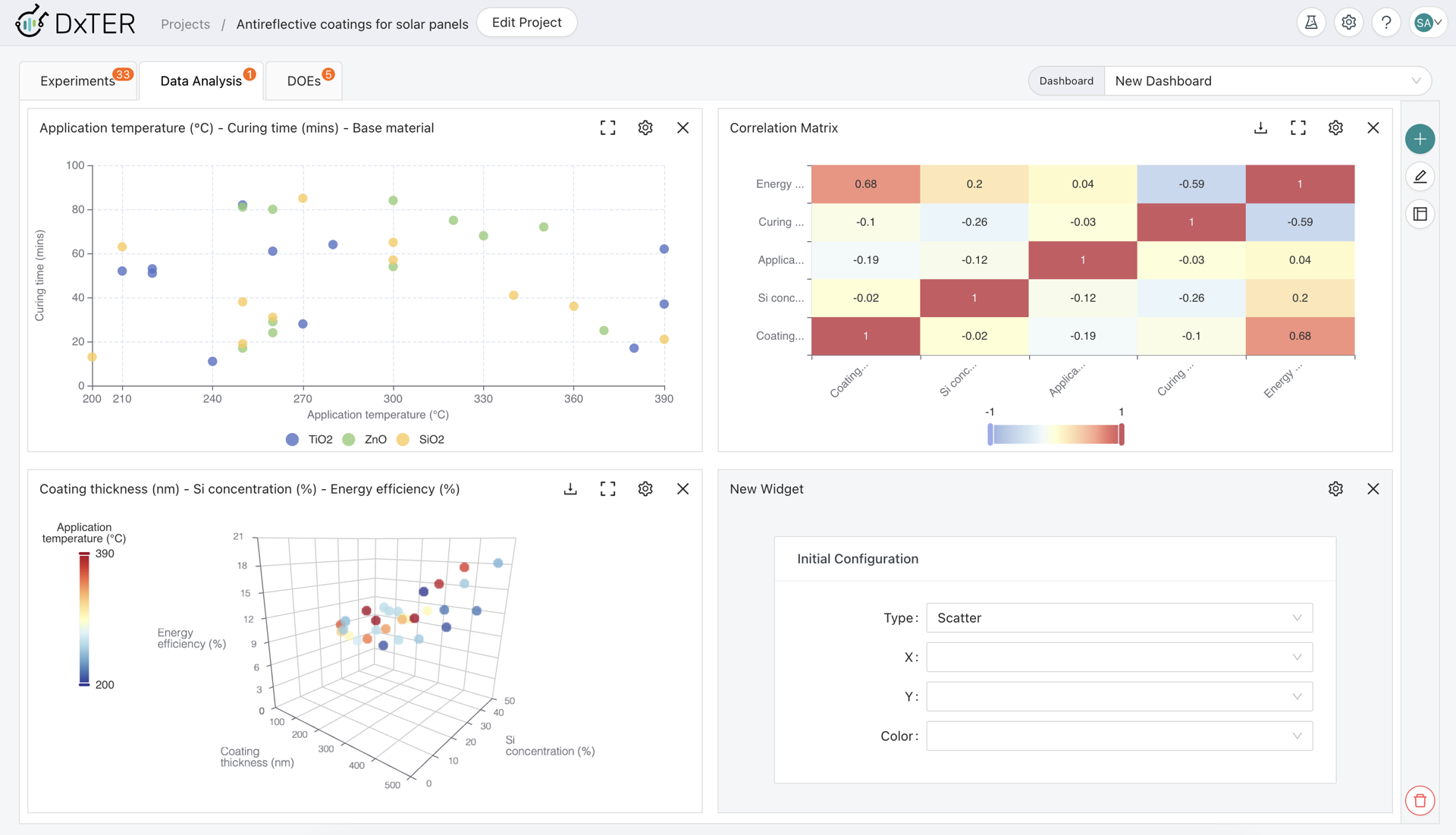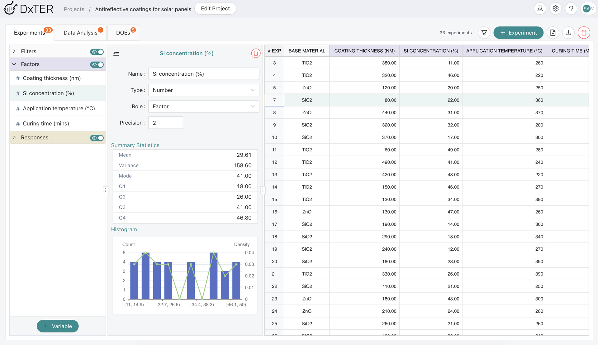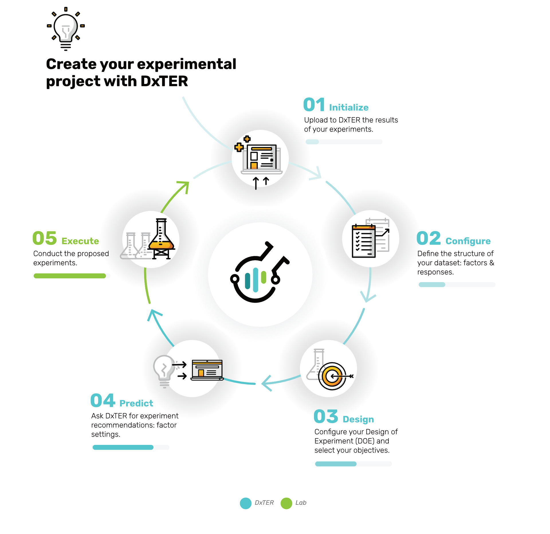 Testing different combinations requires extensive experimentation time. DxTER helps reduce the number of steps needed to achieve the desired result—crucial for the economic viability of the process—by optimizing your Design of Experiments (DOE)